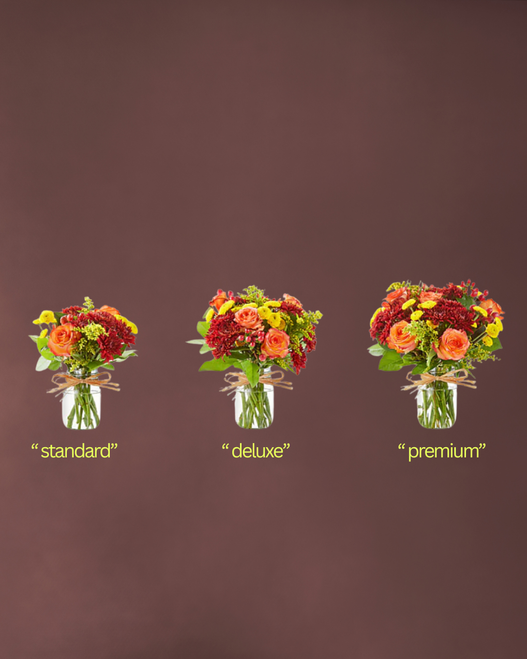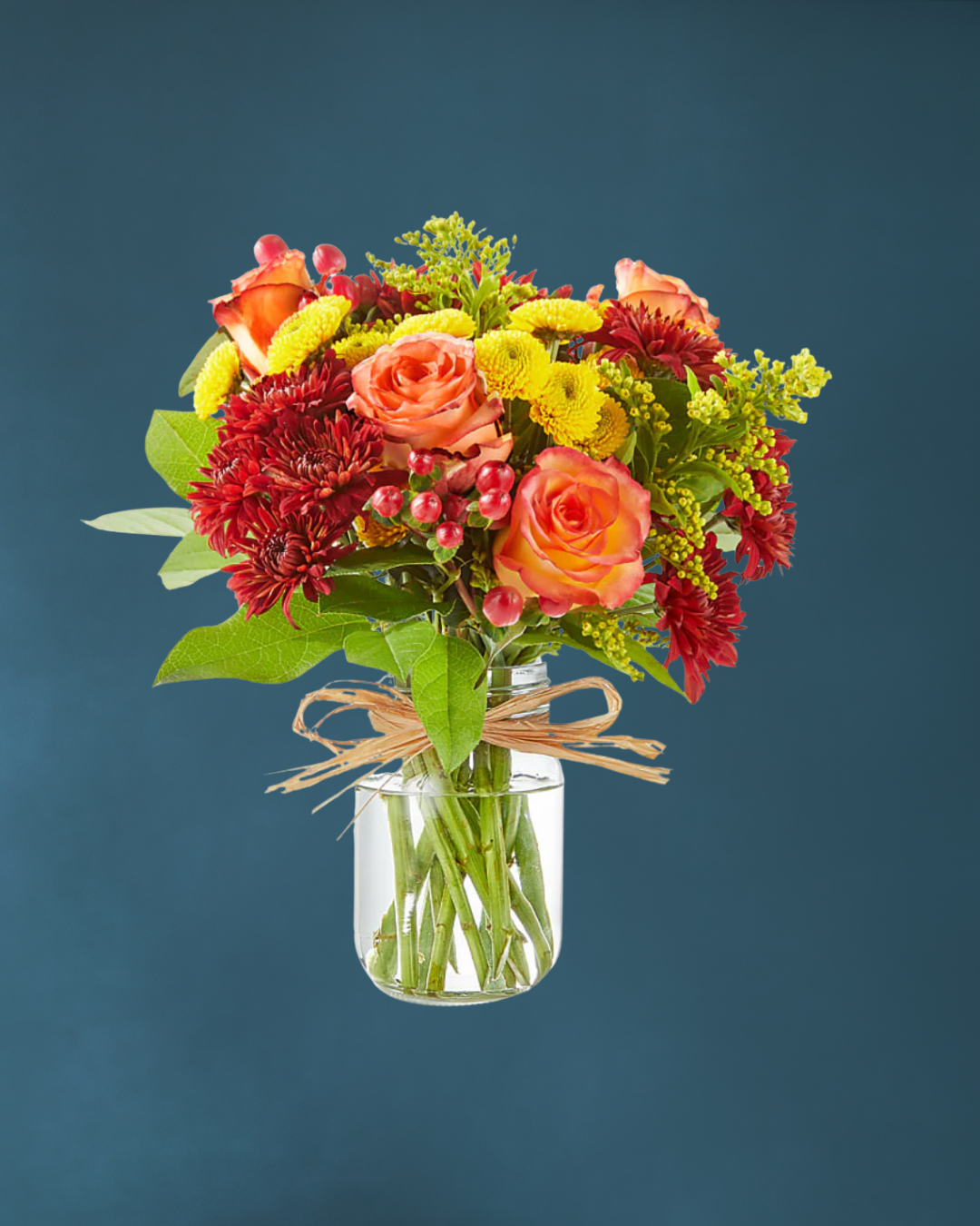 A warm, autumn-inspired arrangement featuring coral roses, golden mums, rust chrysanthemums, berries, and textured greenery. Earthy, romantic, and wrapped in the glow of fall tones.