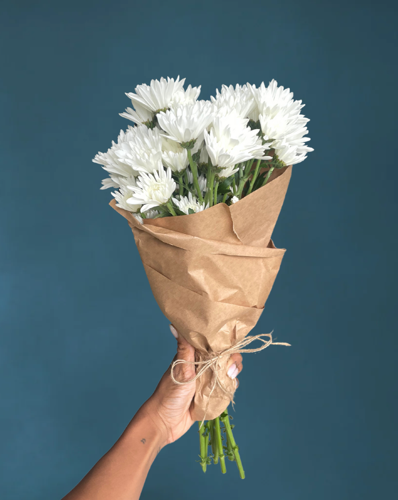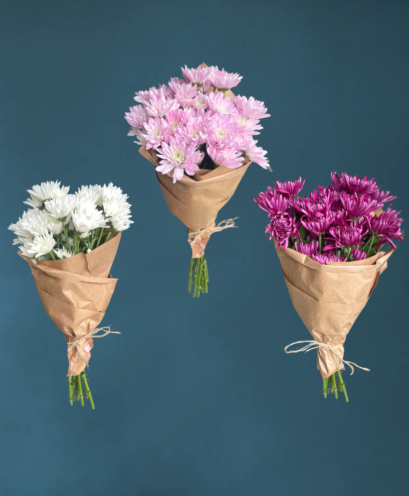 A cheerful trio of single-stem chrysanthemum bouquets, wrapped simply in kraft paper and tied with twine. These easy blooms bring freshness and color to any space—perfect for gifting or keeping. Available in white, lavender, or plum.
