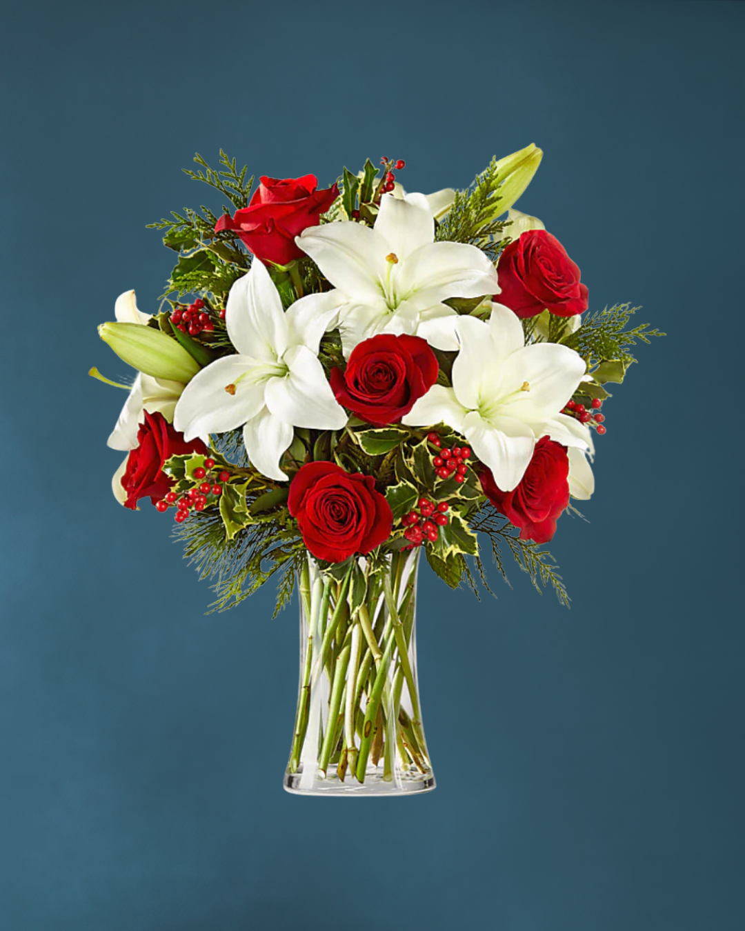 A graceful, winter-inspired blend of snowy white lilies, classic red roses, berries, and lush seasonal greens. Elegant, timeless, and designed to make any room feel like a celebration.